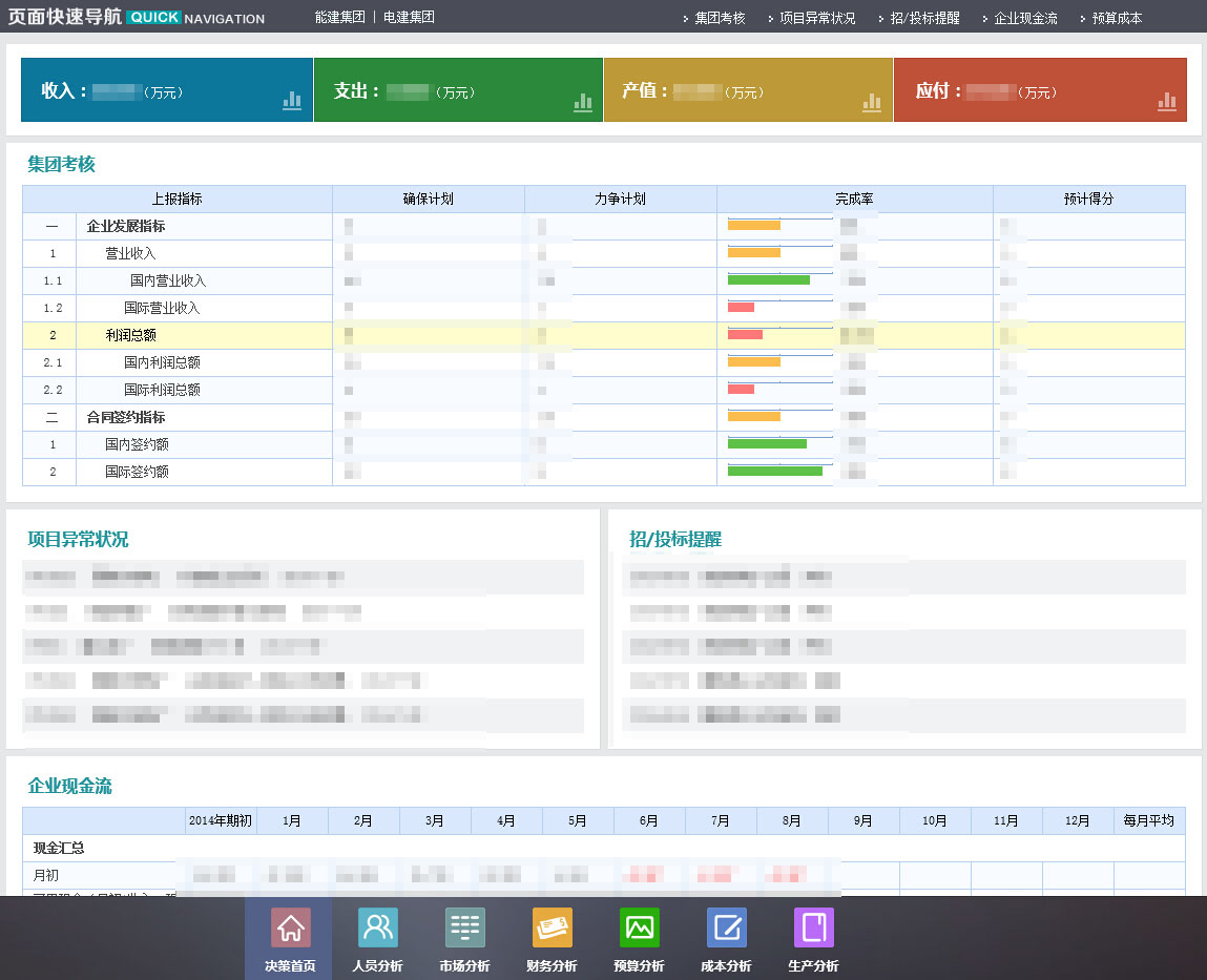 汇总展示合同、营收、收费、利润等经营指标情况等经营指标的完成情况,展示合同、项目、收款之间的对应关系与进展情况,通过丰富的报表、图表进行展示,分析出对企业运营有较大影响的项目的实时状态与存在问题,为领导决策提供依据。