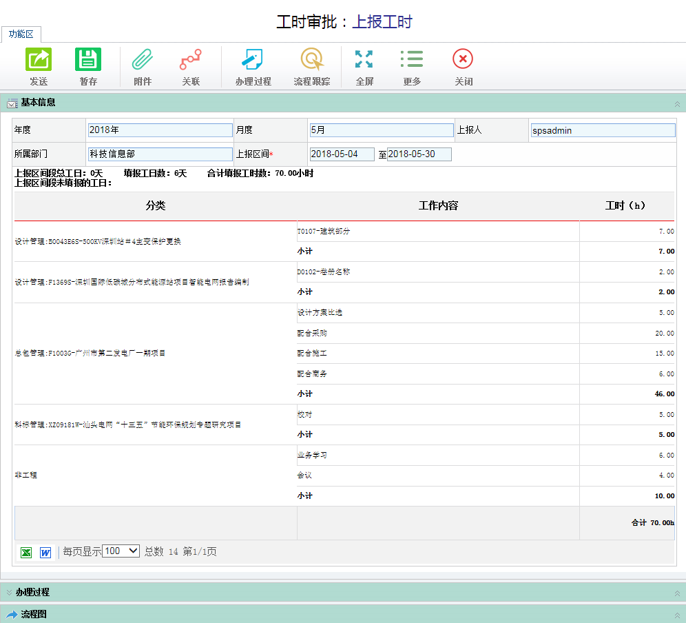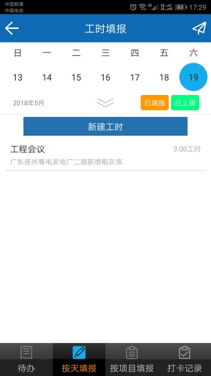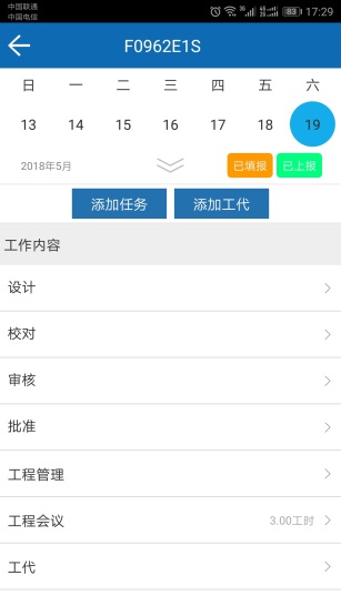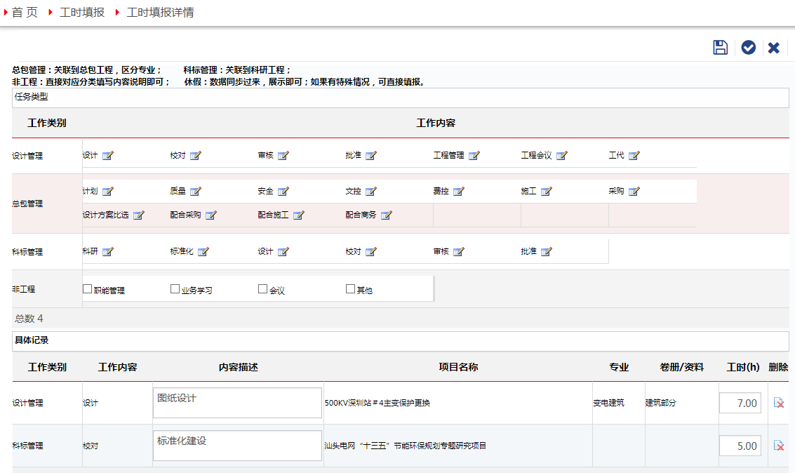 工时填报支持按天、按工程填报,管理的类别涵盖管理、学习、会议等管理工时,设计卷册任务、总包任务、科研工作等生产工时,系统可按天/周/半月定期推送填报任务,并且支持移动端任务推送及工时填报。